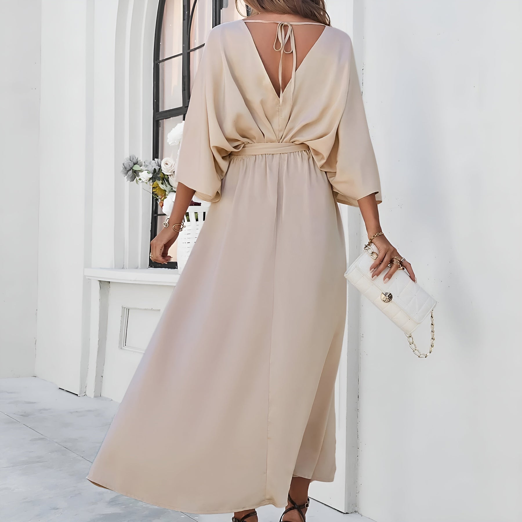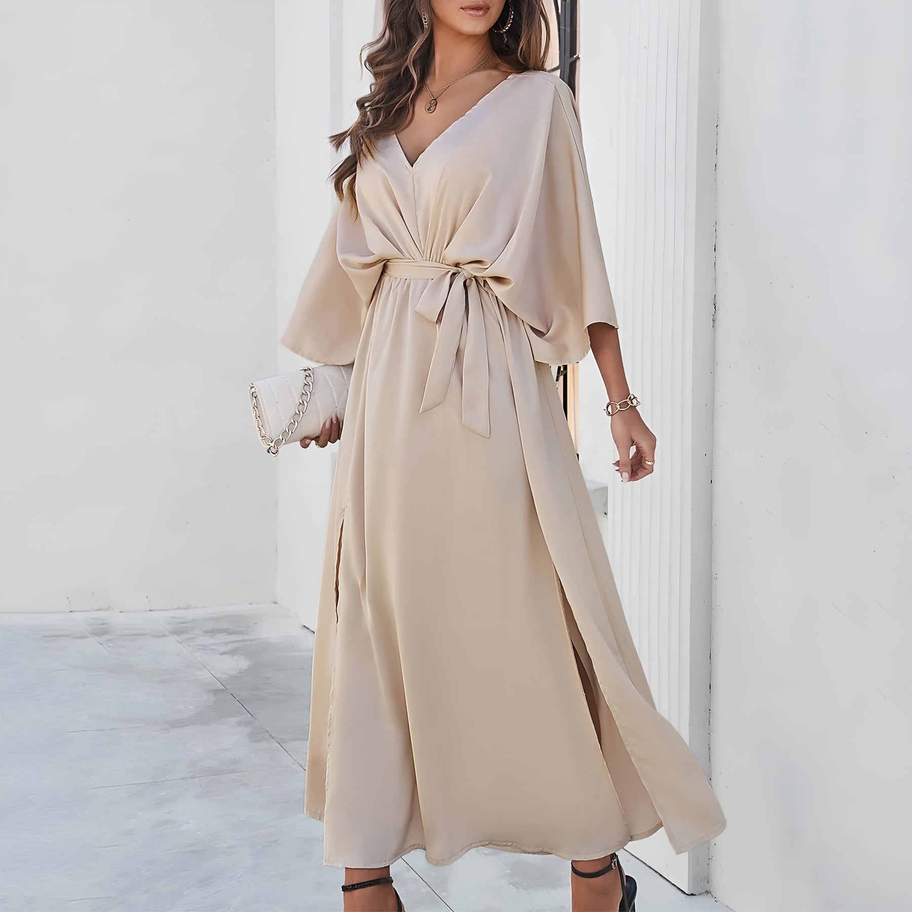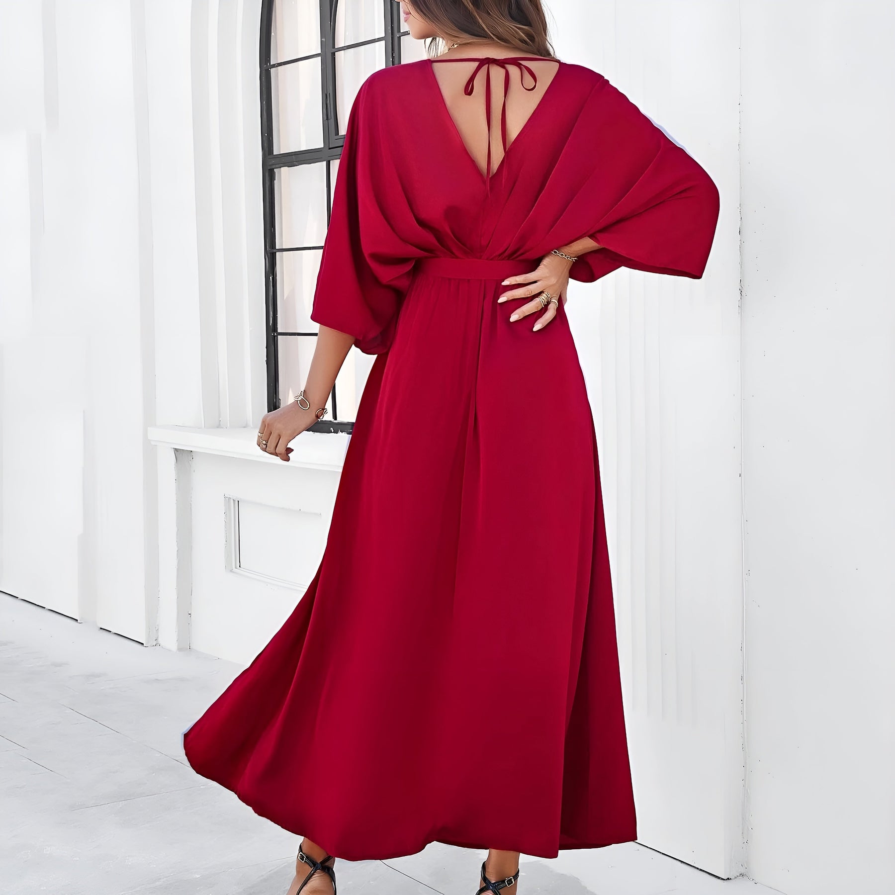 Annalisa™ er kjolen, der får dig til at føle dig selvfølgelig fra første skridt. Det skinnende stof bevæger sig blødt med kroppen og giver dig en elegant tilstedeværelse uden at overtage. Den dybe V-udskæring, de lange ærmer og den markerede talje fremhæver dine former med balance og finesse. Perfekt til aftener, hvor du vil føle dig både fri og stilfuld.