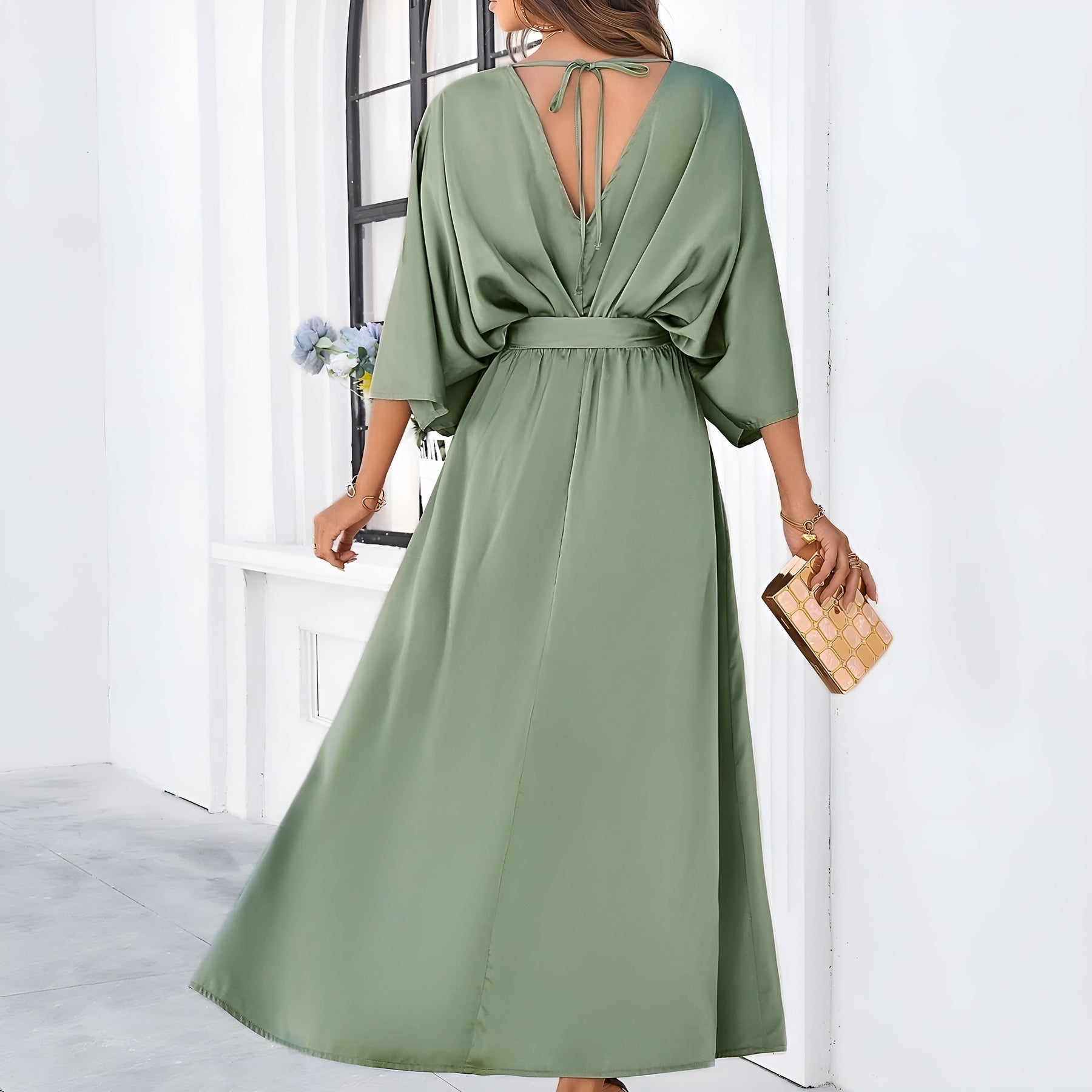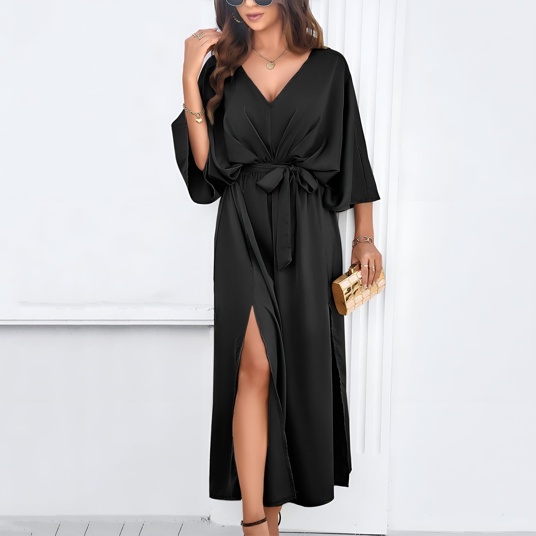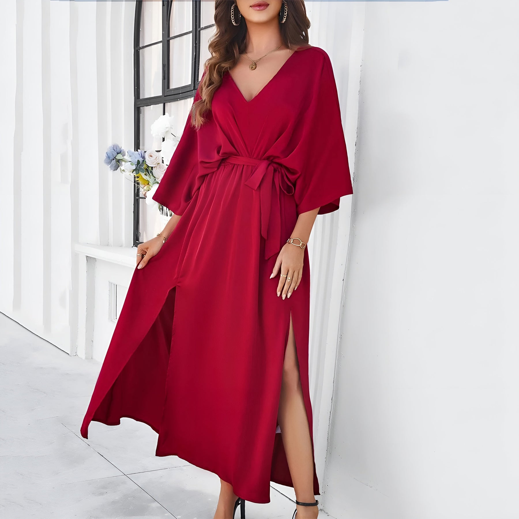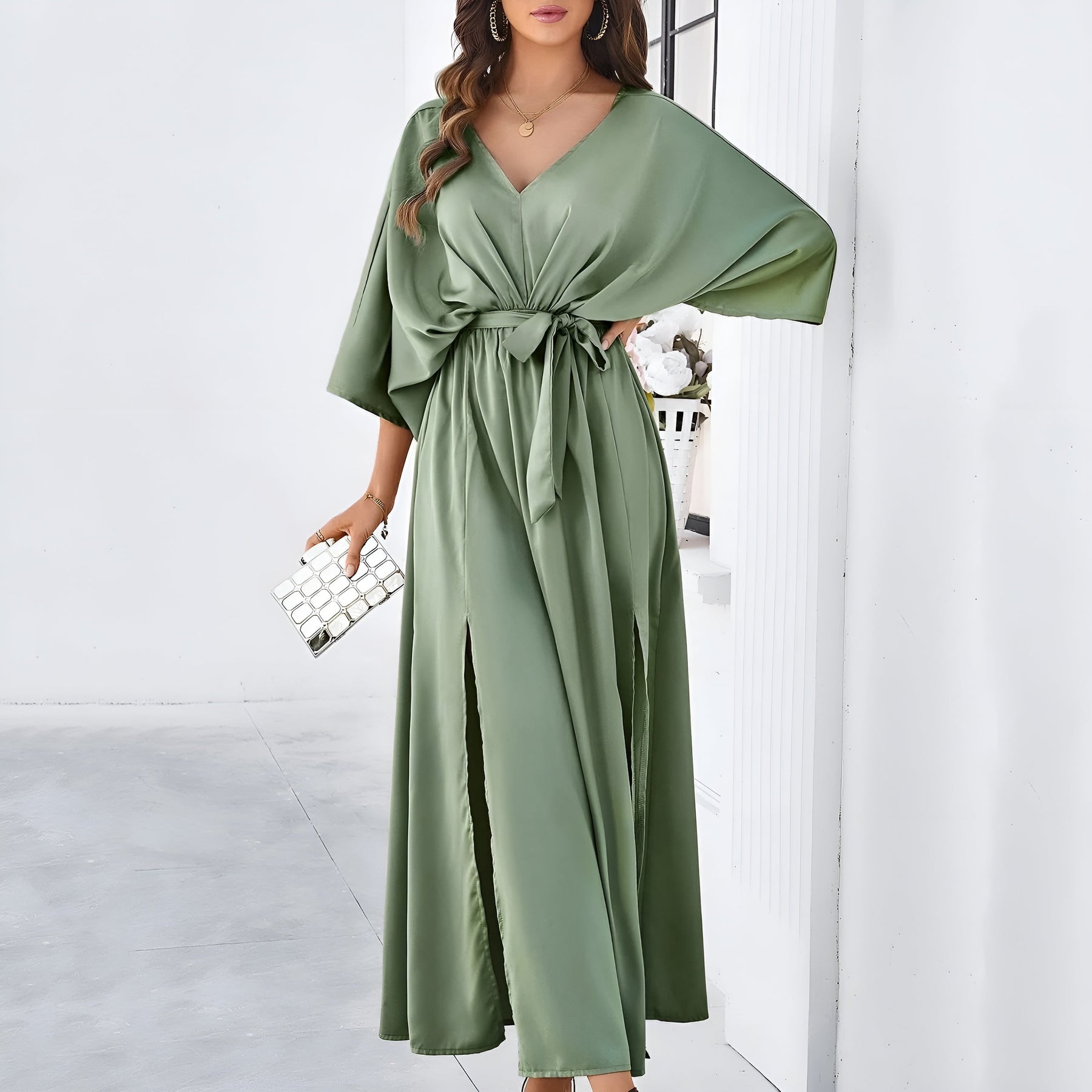 Annalisa™ er kjolen, der får dig til at føle dig selvfølgelig fra første skridt. Det skinnende stof bevæger sig blødt med kroppen og giver dig en elegant tilstedeværelse uden at overtage. Den dybe V-udskæring, de lange ærmer og den markerede talje fremhæver dine former med balance og finesse. Perfekt til aftener, hvor du vil føle dig både fri og stilfuld.